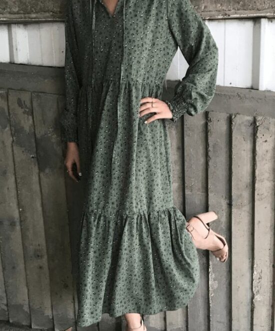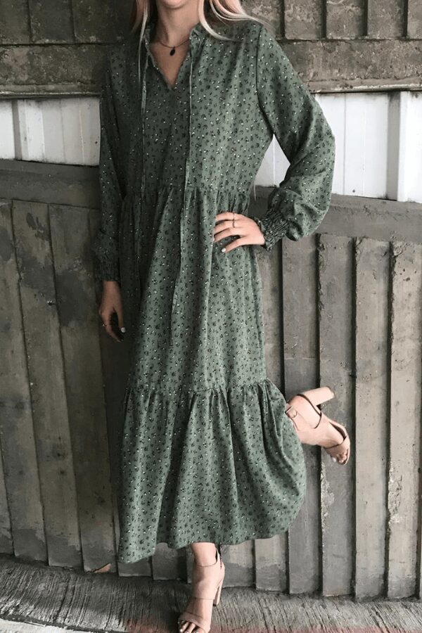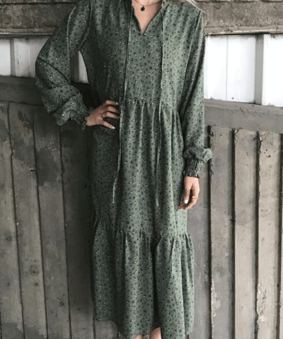 שמלת קומות מקסי עם צווארון סיני וציפקה בשרוול