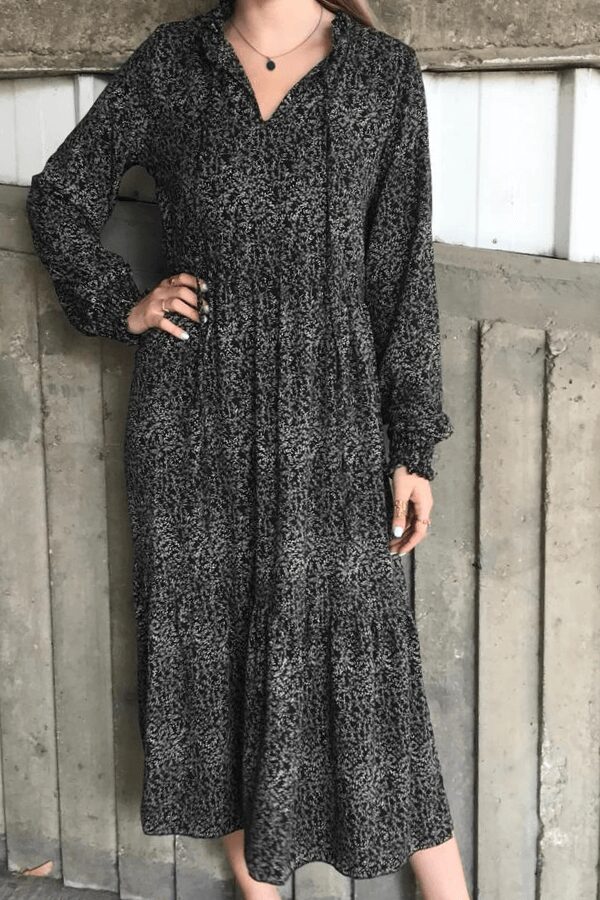 שמלת קומות מקסי עם צווארון סיני וציפקה בשרוול