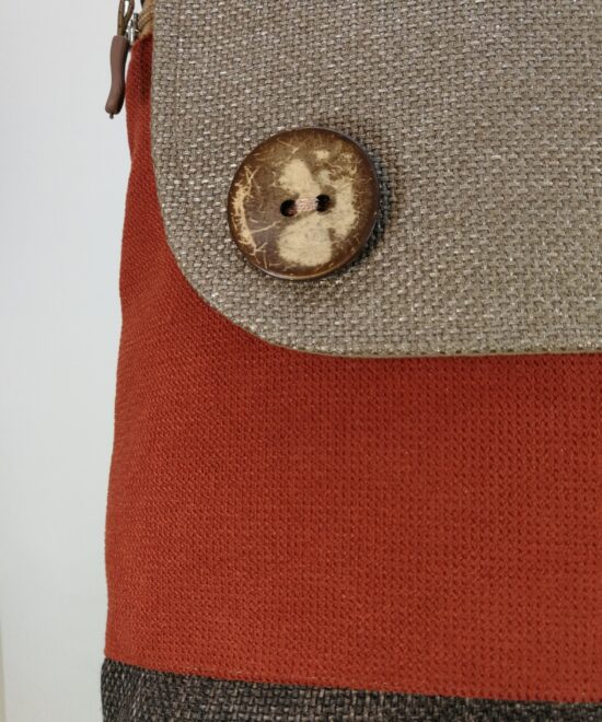 חומרים: בדי ריפוד, קנבסים, בדים מודפסים, בחזית התיק כפתור לקישוט.