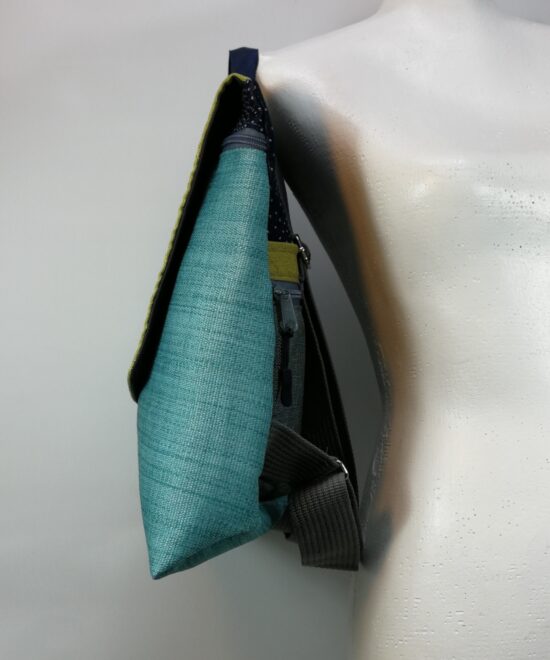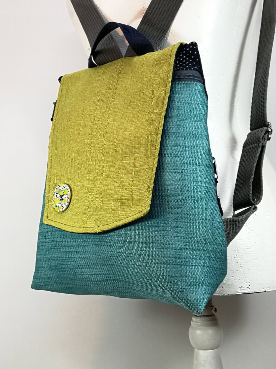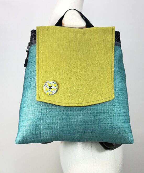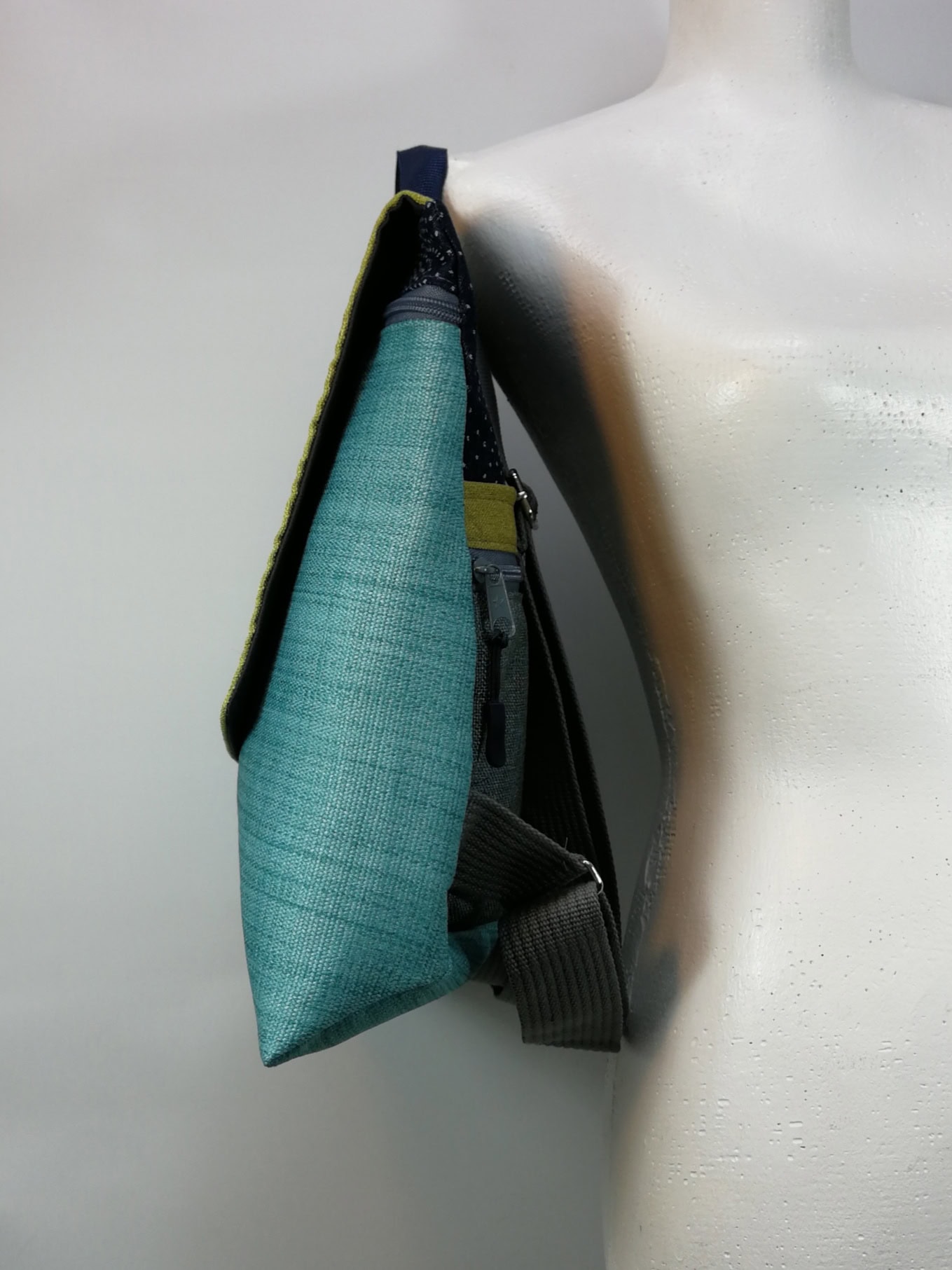חומרים: בדי ריפוד, קנבסים, בדים מודפסים, בחזית התיק כפתור לקישוט.