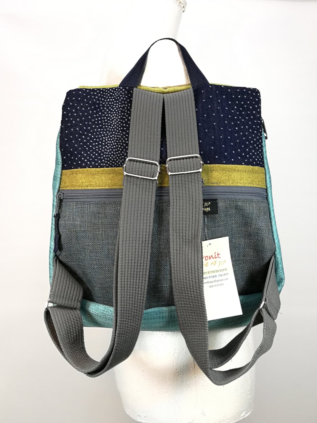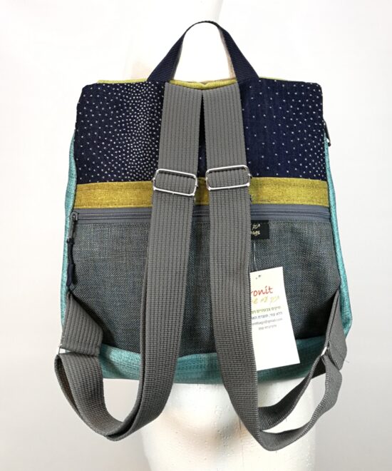 בגב התיק : שלושה כיסים, אחד נסגר ברוכסן שני כיסים פתוחים. מאד נוח לאחסנת הנייד וחפצים שצריכים במהירות, ללא צורך בפתיחת התרמיל.