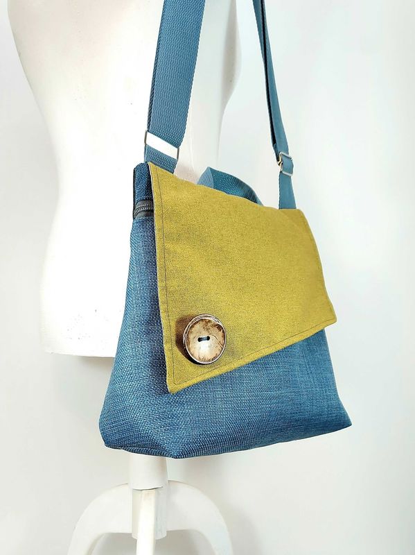 חומרים: בדי ריפוד, גינסים ודרילים, קנבסים, בדים מודפסים, חזית התיק מעוצבת ומקושטת עם כפתור קוקוס.